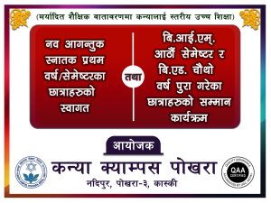 कन्या क्याम्पसमा अध्ययन कक्षा १२ को अन्तिम परीक्षामा उत्तिर्ण हुन सफल छात्राहरुलाई सम्मान तथा बधाइ कार्यक्रम Read More »